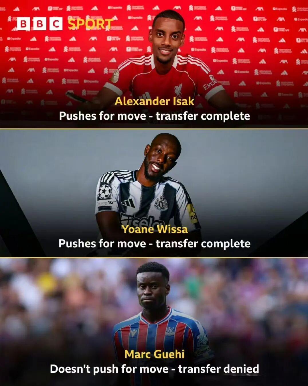像伊萨克、约克雷斯、维萨等人都采用罢训的方式逼宫球队,最终伊萨克在截止日以创纪录1.3亿英镑加盟利物浦,维萨5000万加盟纽卡。约克雷斯则在英超开赛前就加盟阿森纳,他们都在转会窗关闭前转会成功。