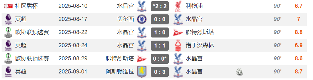 其中英超前3轮全勤,欧协联附加赛2场,社区盾决赛1场,帮助伦敦之鹰首夺社区盾冠军,晋级欧协联正赛,英超3轮1胜2平保持不败。